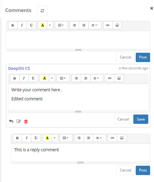 To reply to a comment, click the **Reply** icon in the comment as shown in the following image.